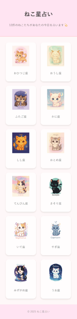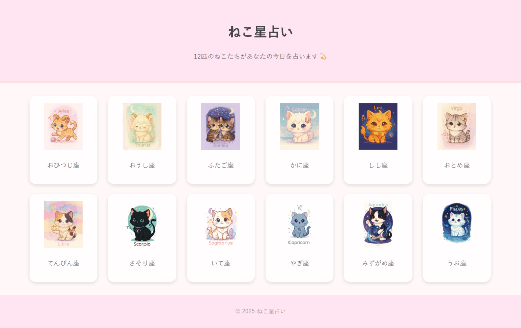可愛い猫と星座占いを組み合わせることで、年齢や知識に関係なく誰もが楽しめるインタラクティブなな占いサイトを作りたいと考えました。12星座それぞれに猫のキャラクターを設定し、パステル調でやさしい雰囲気を目指しました。