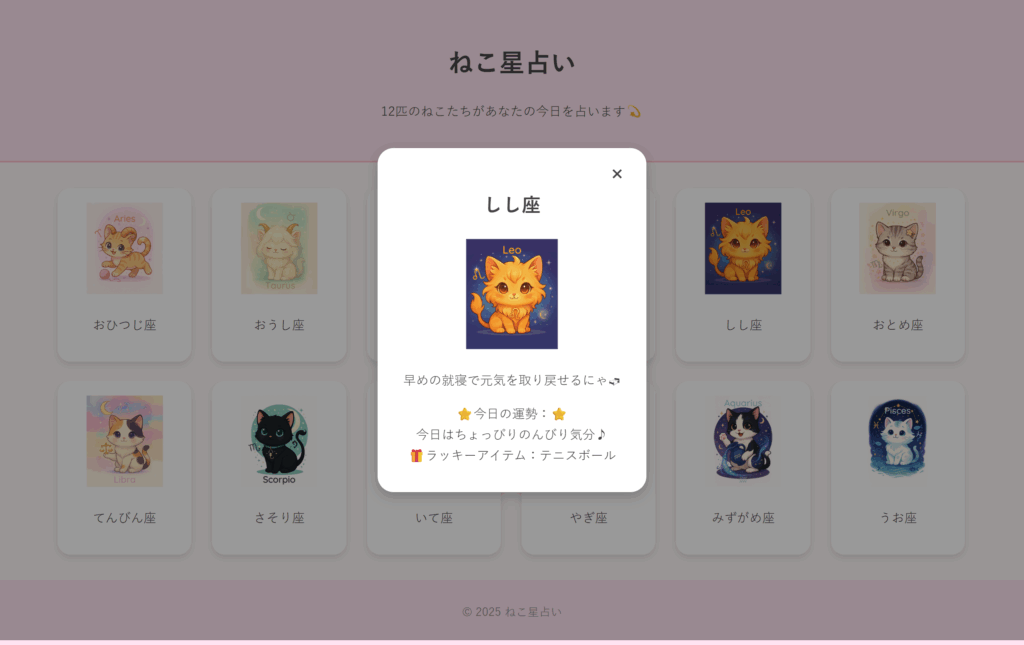 - HTML/CSS/JSを用い、猫をクリックするとランダムに「今日の運勢」や「ラッキーアイテム」が表示される仕組みを実装